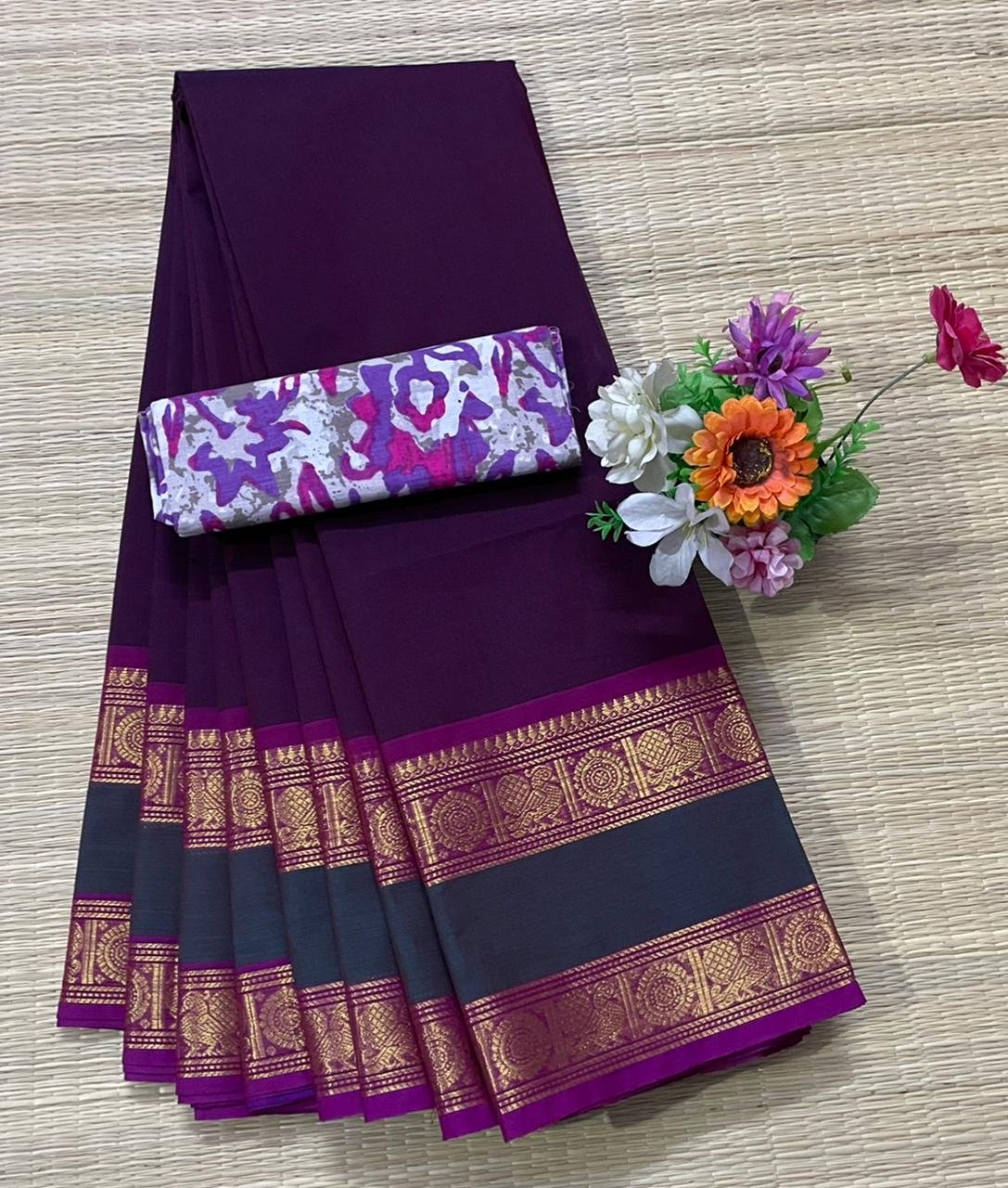 This plum handloom Kanchi cotton saree is made from 80’s count pure cotton, offering a rich and graceful look. It features a contrasting grey border adorned with intricate gold zari work. The saree is 5.5 meters in length and comes with a 1-meter Kalamkari-style blouse piece for added flair.