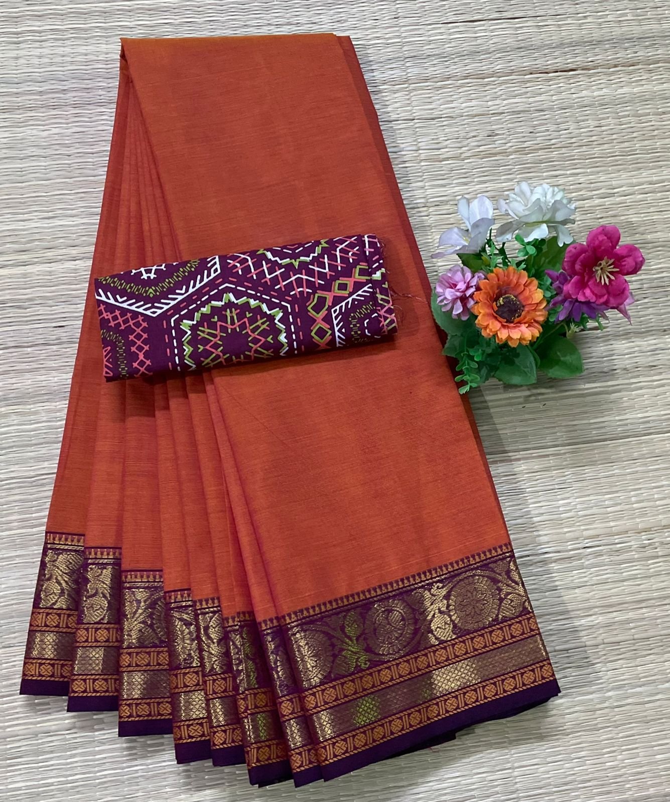 This elegant Kanchi 80’s count cotton saree showcases a rich rust orange body paired with a beautifully woven maroon zari border featuring floral and paisley motifs. It comes with a 1-meter printed blouse fabric in matching tones. A perfect blend of classic elegance and modern charm for any occasion.