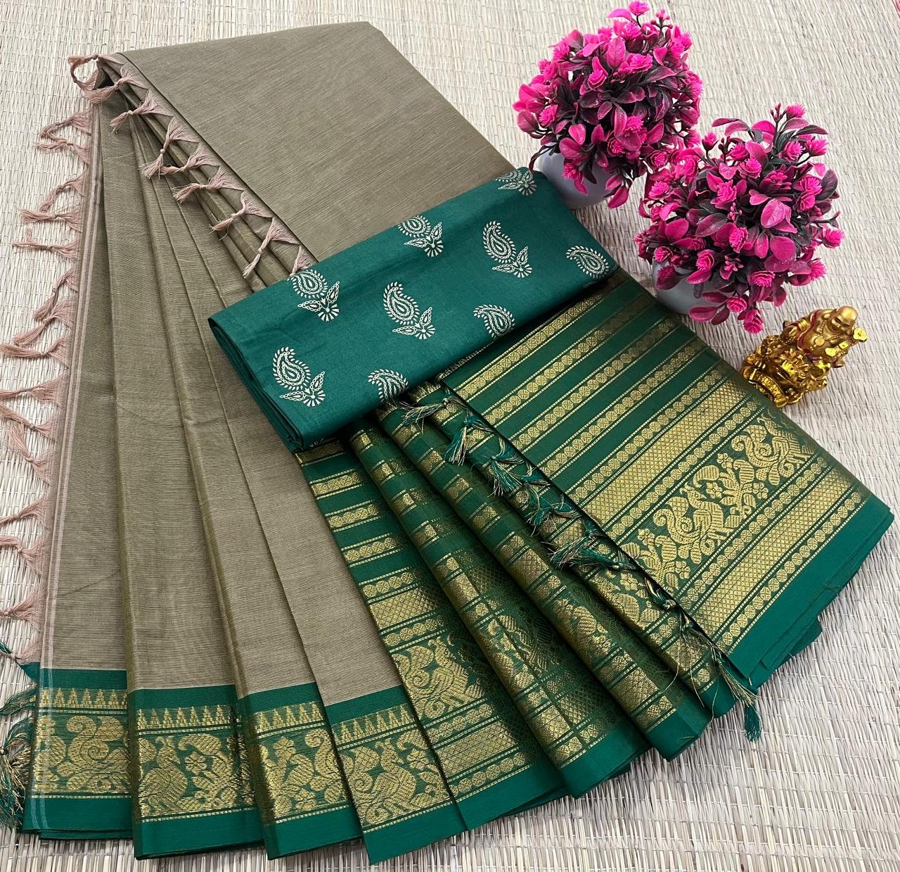 This olive green Kanchi cotton saree features a striking deep bottle green border and pallu, adorned with intricate gold zari work. Crafted from soft, breathable 100-count cotton, it’s perfect for daily elegance or festive charm. Comes with a running blouse and designer blouse option for a complete ethnic look.