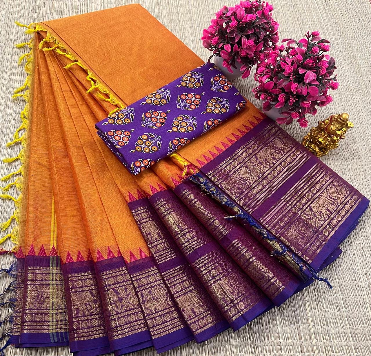This stunning orange Kanchi cotton saree is crafted from soft 100-count cotton and features an elegant violet zari border with temple motifs. The pallu is beautifully detailed, adding a regal touch. Perfect for festive occasions, it comes with a running blouse and optional designer blouse fabric to elevate the look.