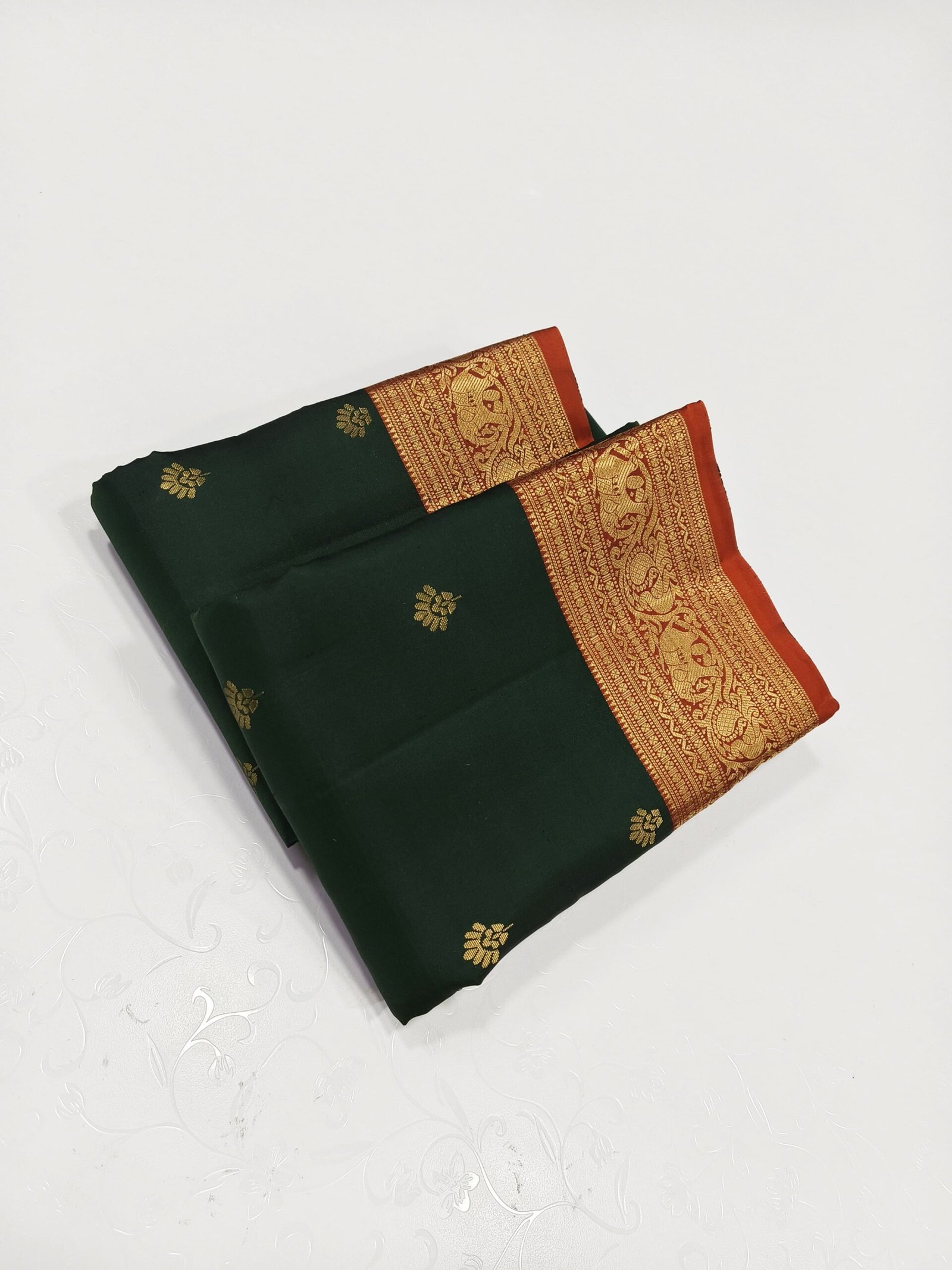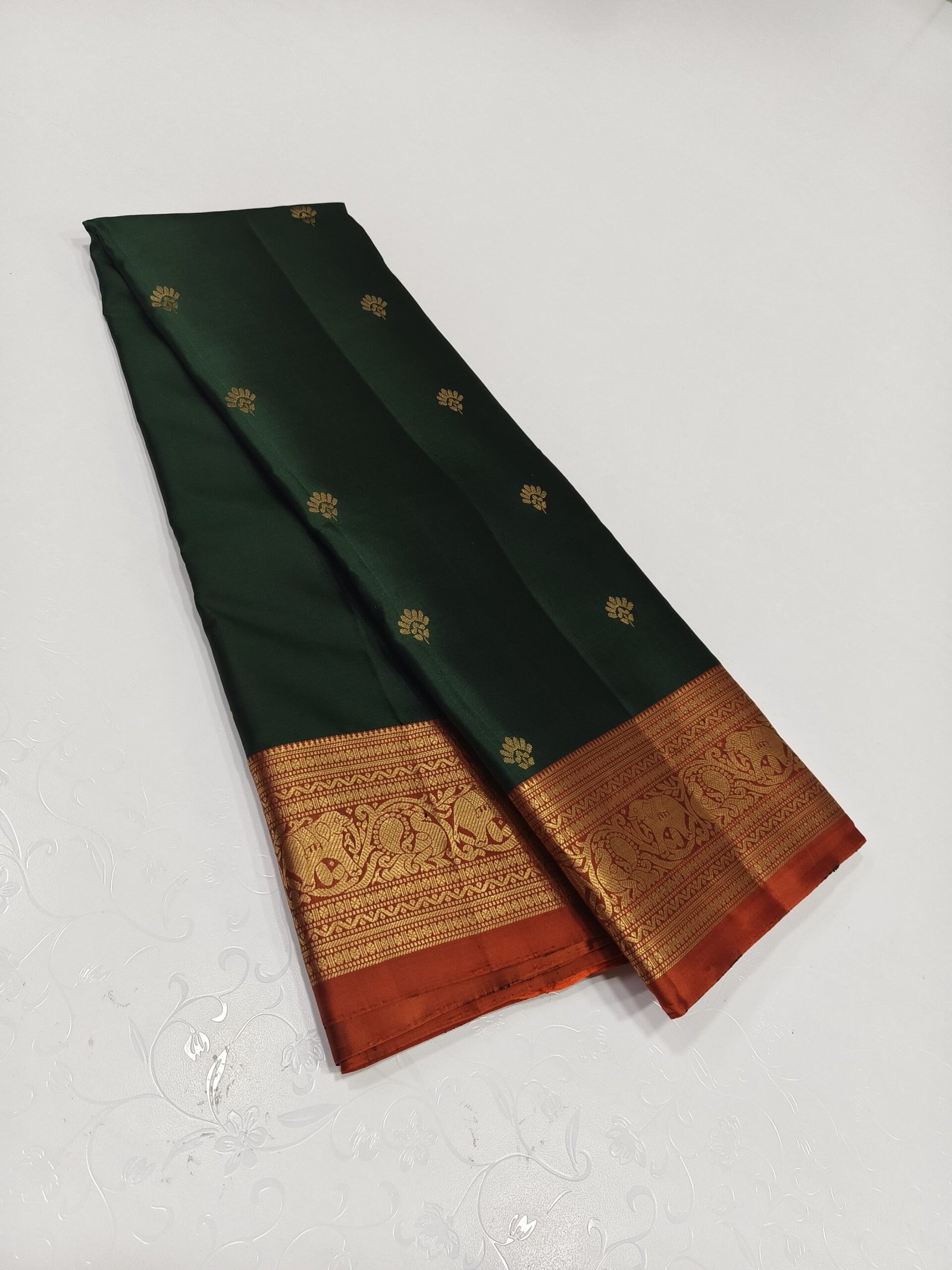 Pure Kanchipuram Silk Saree – Bottle Green & Rust Orange